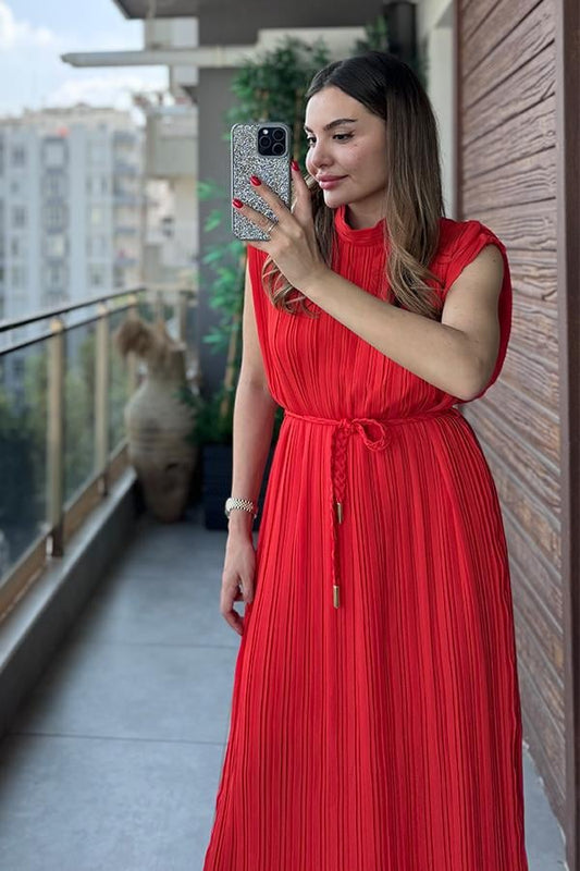 3 AL 2 ÖDENicky Bel Kemerli Piliseli Kırmızı Elbise