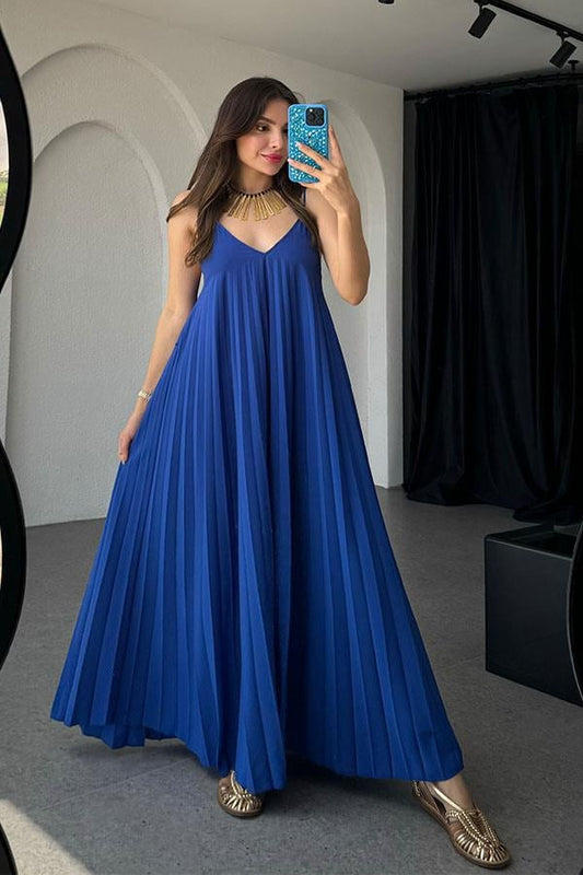 Niren Orijinal Piliseli Elbise Elbise-Saks Mavi