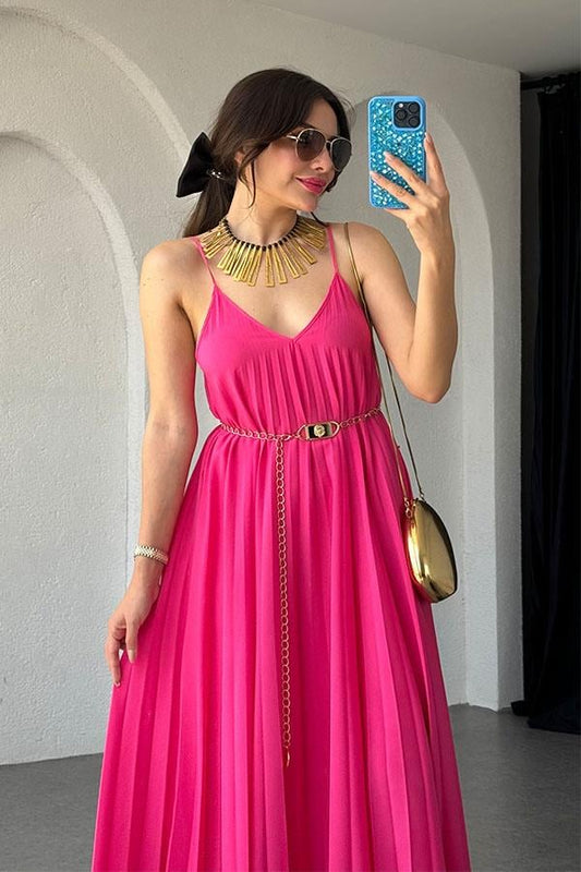 3 AL 2 ÖDENiren Orijinal Piliseli Elbise Elbise-Fuşya