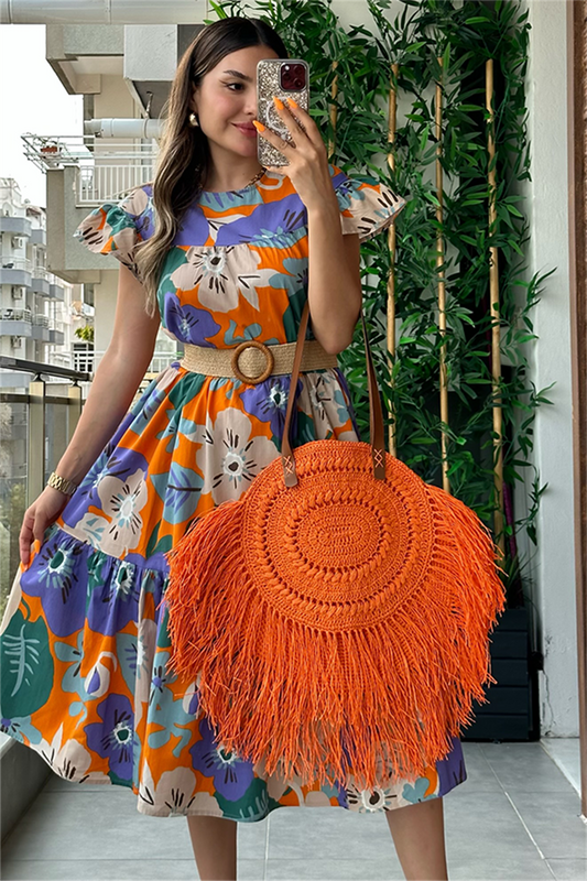 3 AL 2 ÖDENora turuncu lila çiçek desen çan elbise