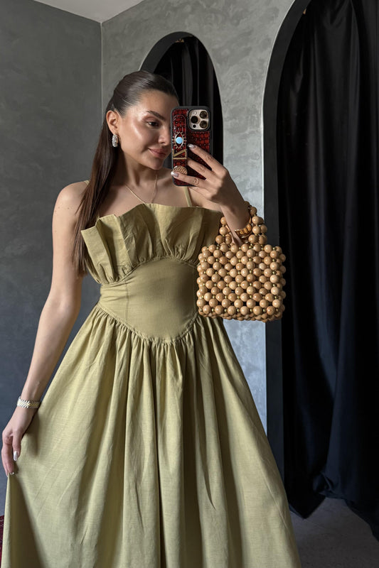 3 AL 2 ÖDENovella Yağ Yeşili Askılı Keten Elbise