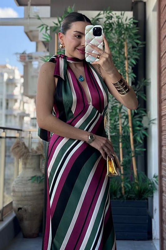 Oliwia Boyundan Bağlamalı Saten Elbise - Haki