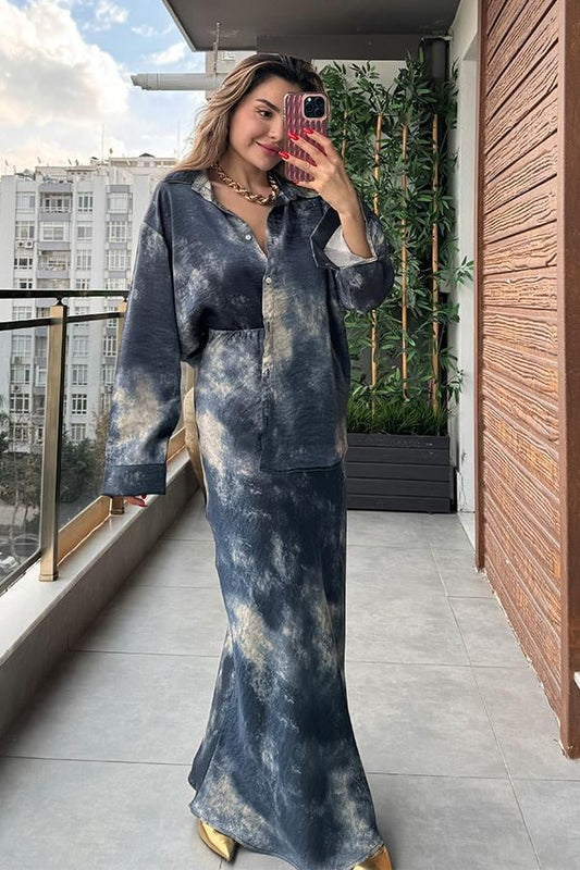 Olya Batik Desenli Gömlek Etek Takım - Lacivert