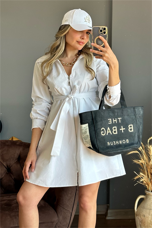3 AL 2 ÖDEÖnden full fermuarlı keten beyaz elbise