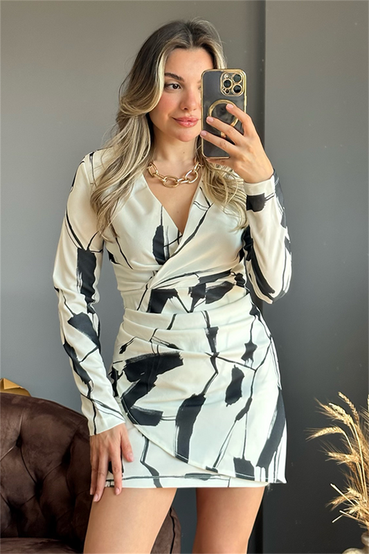 3 AL 2 ÖDEÖnü kruvaze siyah beyaz batik desenli elbise