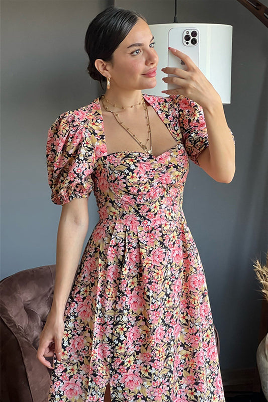 3 AL 2 ÖDEPembe çiçekli balon kol keten elbise