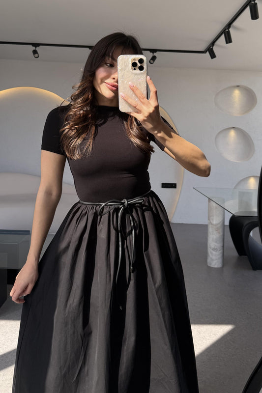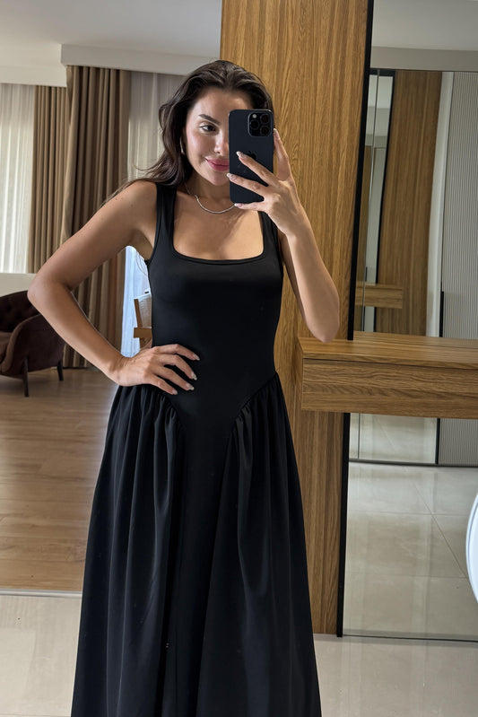Perast Siyah Belden Oturtmalı Maxi Modal Elbise