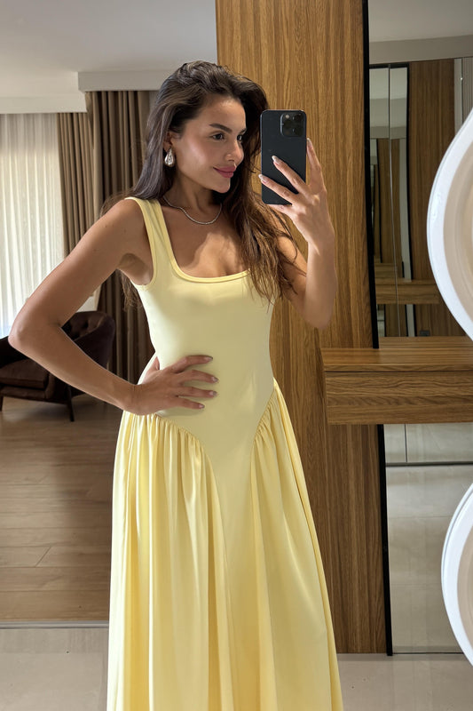 Perast Sarı Belden Oturtmalı Maxi Modal Elbise