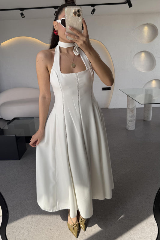 Pimenta Beyaz Boyundan Bağlamalı Atlas Elbise