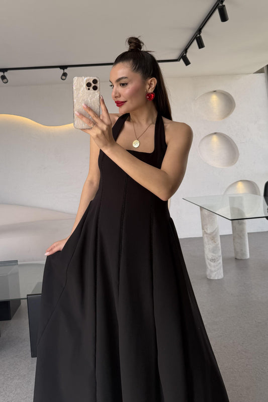 Pimenta Siyah Boyundan Bağlamalı Atlas Elbise