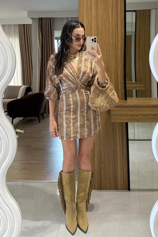 Ravira Bej Fistolu Balon Kol Ön Düğümlü Elbise