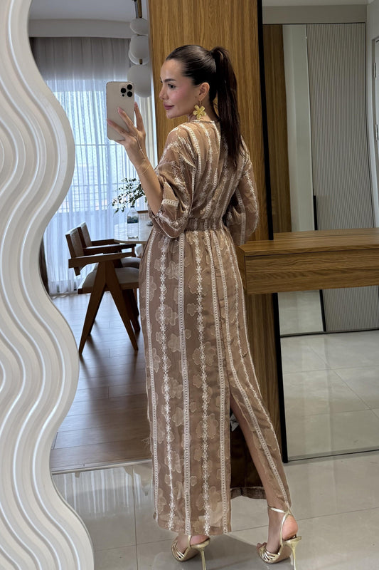 3 AL 2 ÖDERavira Kahve Uzun Fistolu Ön Düğümlü Elbise