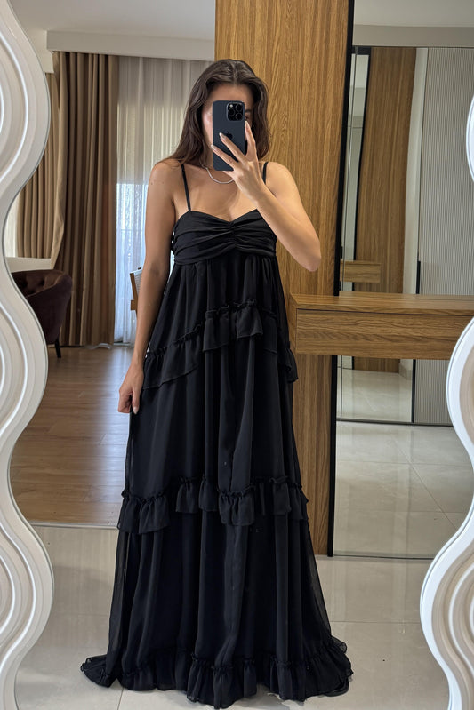 Rigas Siyah Kat Kat Volanlı Askılı Şifon Maxi Elbise