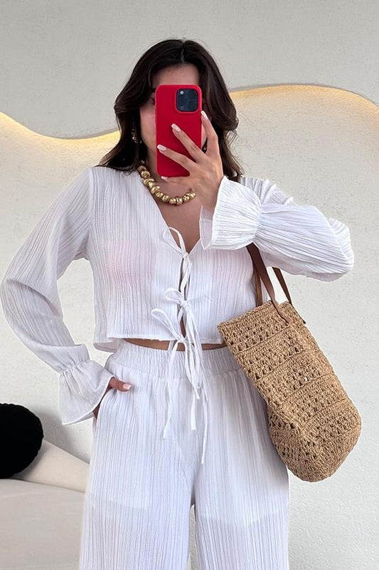 3 AL 2 ÖDERio Bağcıklı Bluz Pantolon Takım - Beyaz