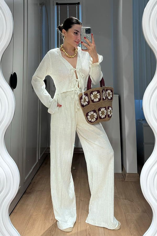 3 AL 2 ÖDERio Bağcıklı Bluz Pantolon Takım - Krem