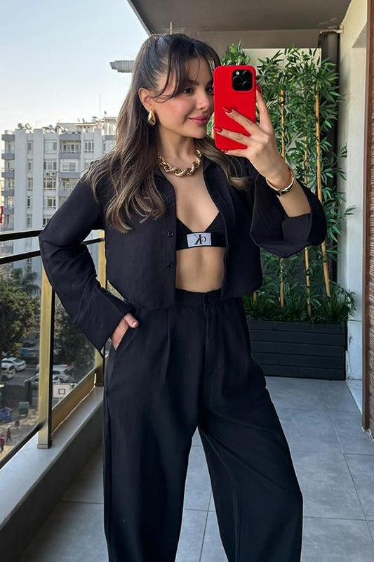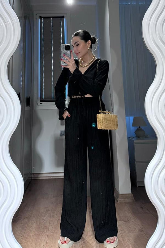 3 AL 2 ÖDERio Bağcıklı Bluz Pantolon Takım - Siyah