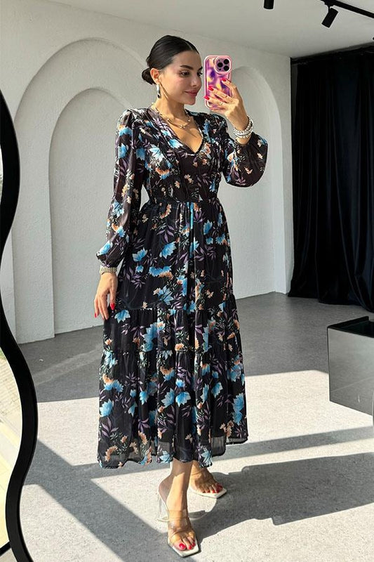 3 AL 2 ÖDERina Siyah Desenli Şifon Elbise