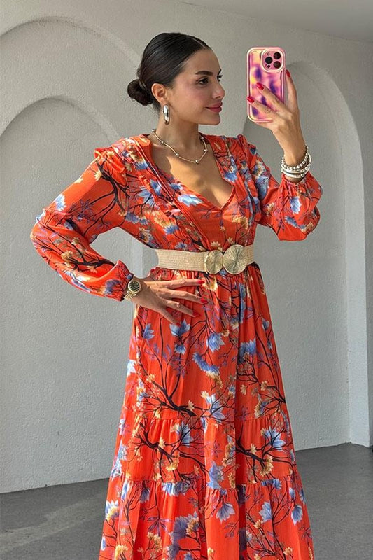 3 AL 2 ÖDERina Turuncu Desenli Şifon Elbise