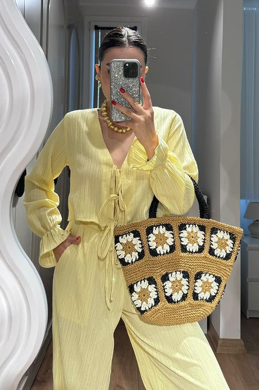 3 AL 2 ÖDERio Bağcıklı Bluz Pantolon Takım - Sarı