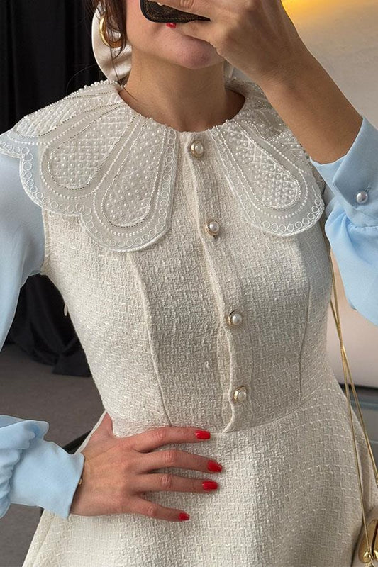Romona Tüvit Yakası Taşlı İnci Düğmeli Elbise