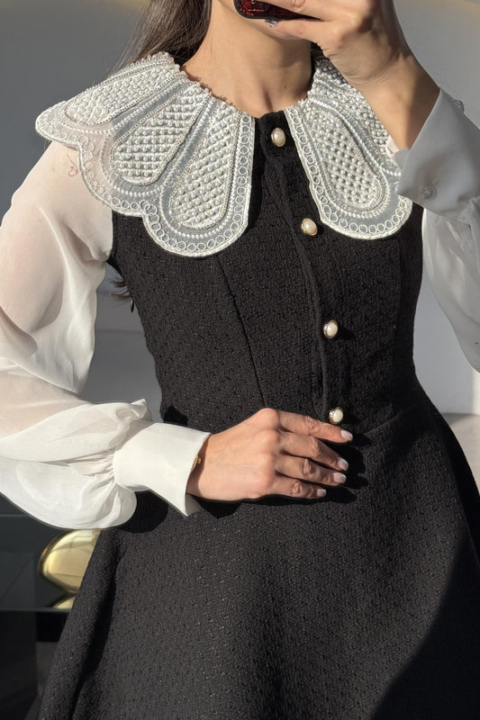 Romona Siyah Tüvit Yakası Taşlı İnci Düğmeli Elbise