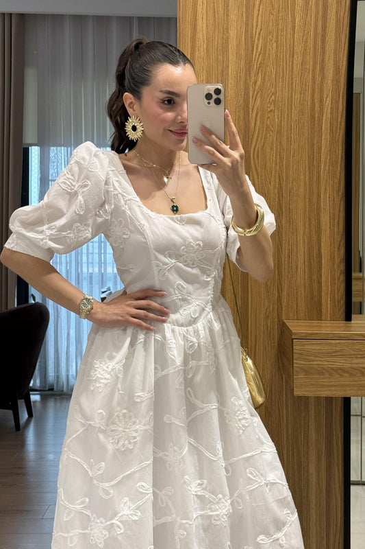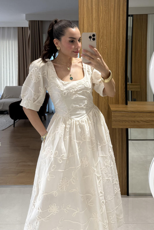 3 AL 2 ÖDERoselune Beyaz Balon Kol Brode Nakış Elbise