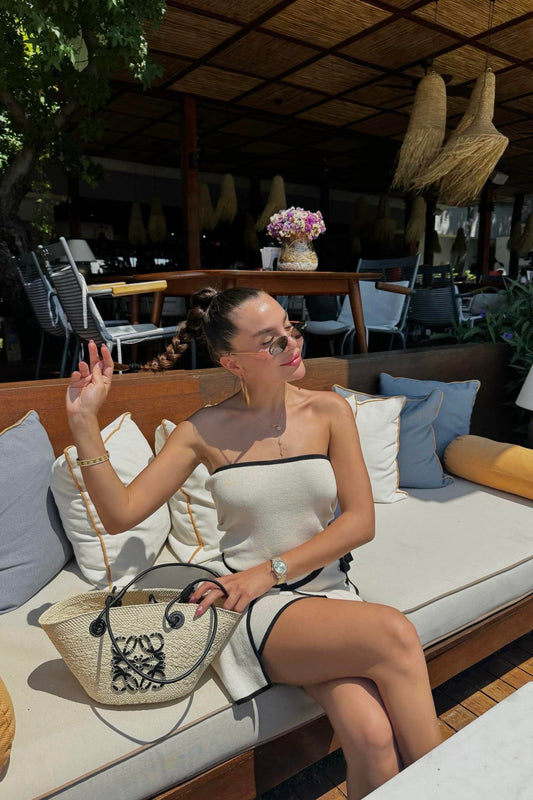 3 AL 2 ÖDESanba Krem Çizgi Geçişli Basic Triko Elbise