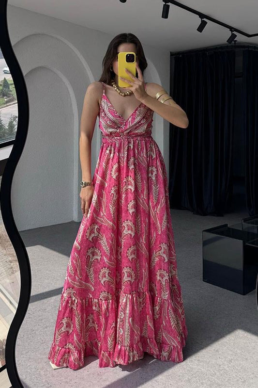 3 AL 2 ÖDESare Desenli Saten Fuşya Elbise