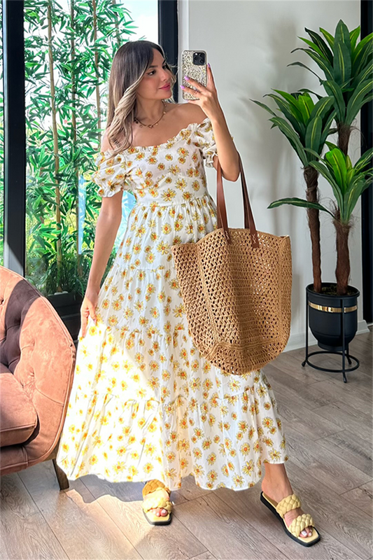 3 AL 2 ÖDESarı çiçekli kalp yaka saten elbise