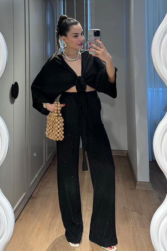 Soares Keten Bağlamalı Bluz Pantolon Takım-Siyah