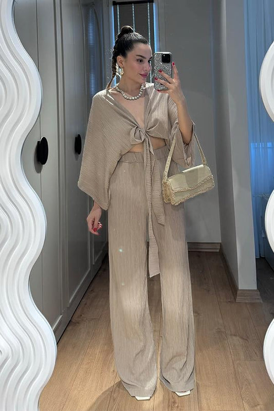 Soares Keten Bağlamalı Bluz Pantolon Takım-Vizon