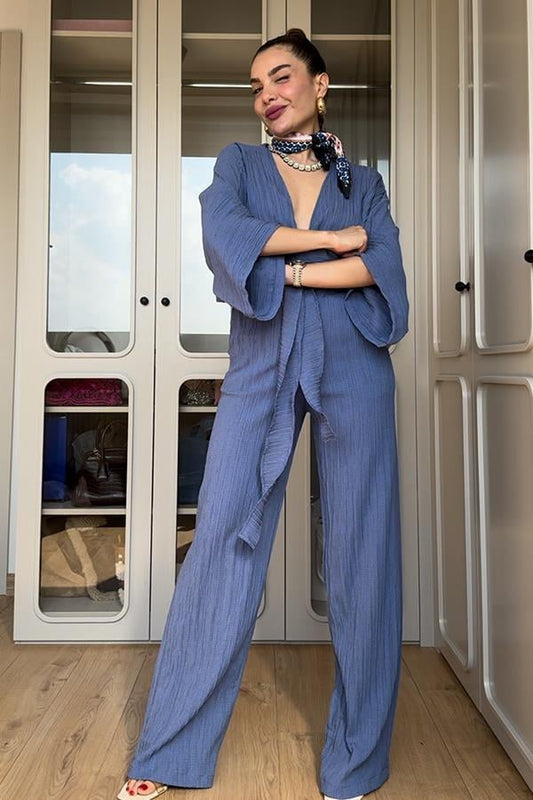 Soares Keten Bağlamalı Bluz Pantolon Takım-Mavi
