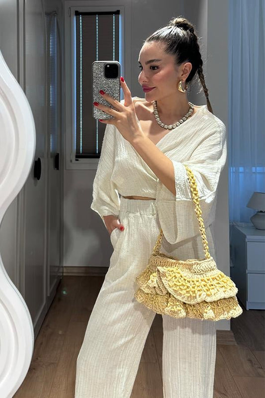 Soares Keten Bağlamalı Bluz Pantolon Takım-Ekru