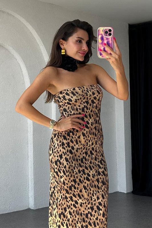 Tarumei Straplez Yırtmaç Detaylı Leopar Elbise