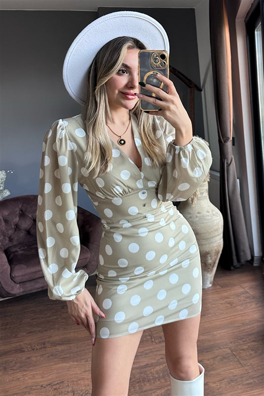 3 AL 2 ÖDETaş rengi beyaz puantiyeli balon kol elbise