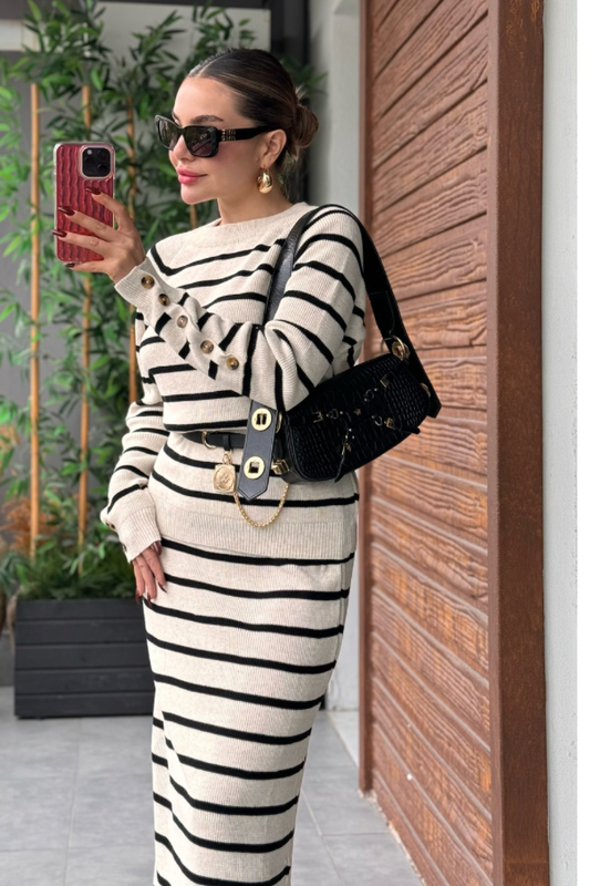 3 AL 2 ÖDETatya Çizgili Örme Triko Takım - Beyaz