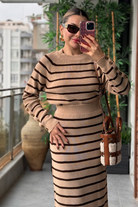 3 AL 2 ÖDETatya Çizgili Örme Triko Takım - Karamel