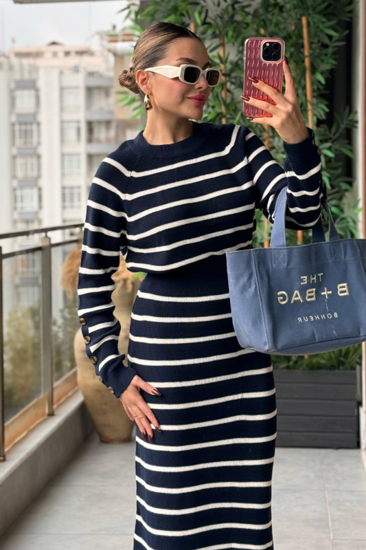 3 AL 2 ÖDETatya Çizgili Örme Triko Takım - Lacivert