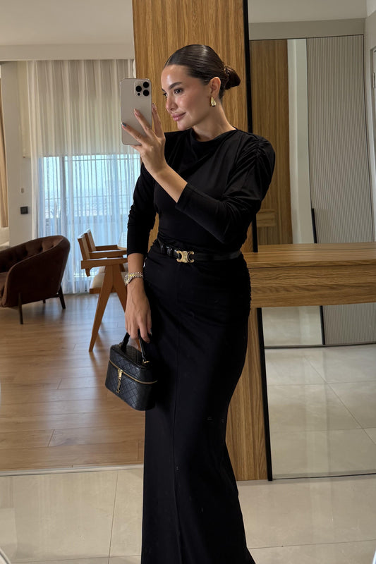 3 AL 2 ÖDETek omuz dekolteli siyah elbise