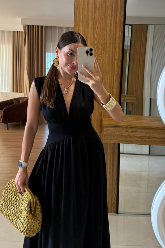 3 AL 2 ÖDETatyana Siyah Yırtmaçlı V yaka Elbise