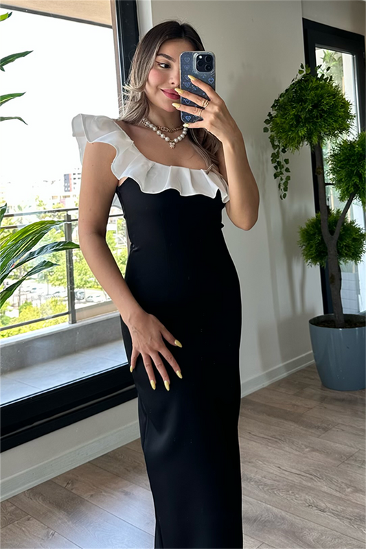 3 AL 2 ÖDETek omuz beyaz fırfır detaylı kalem elbise