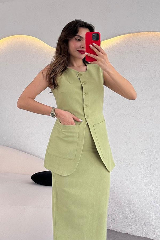 3 AL 2 ÖDETricia Premium Etekli Keten Takım-Yağ Yeşil