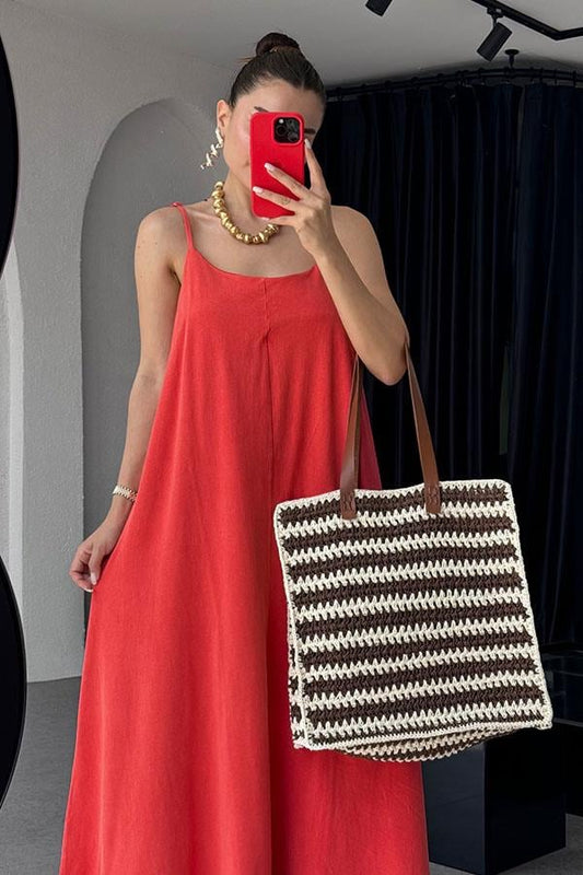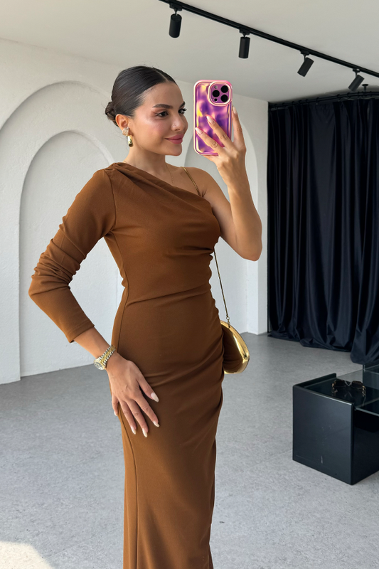 3 AL 2 ÖDETulina tek omuz kahve drapeli elbise