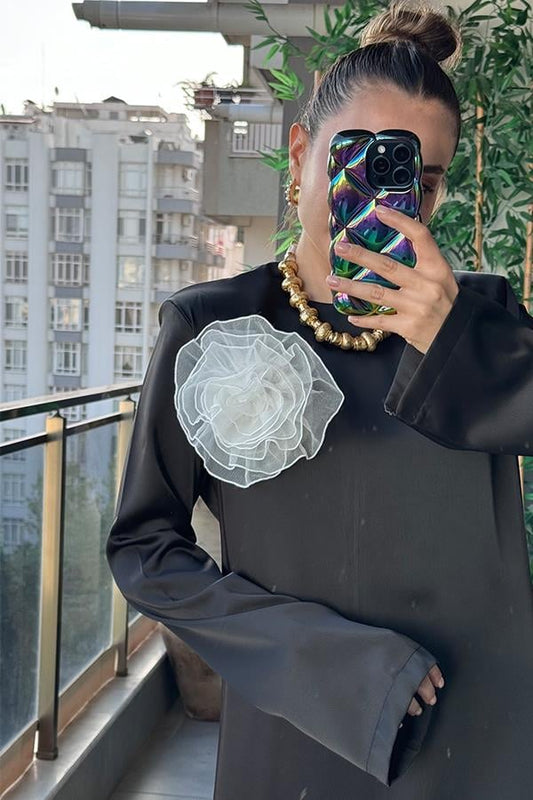 3 AL 2 ÖDETually Vatkalı Siyah Saten Elbise
