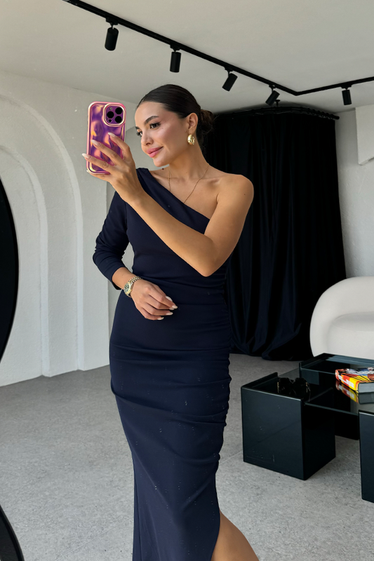 3 AL 2 ÖDETulina tek omuz lacivert drapeli elbise