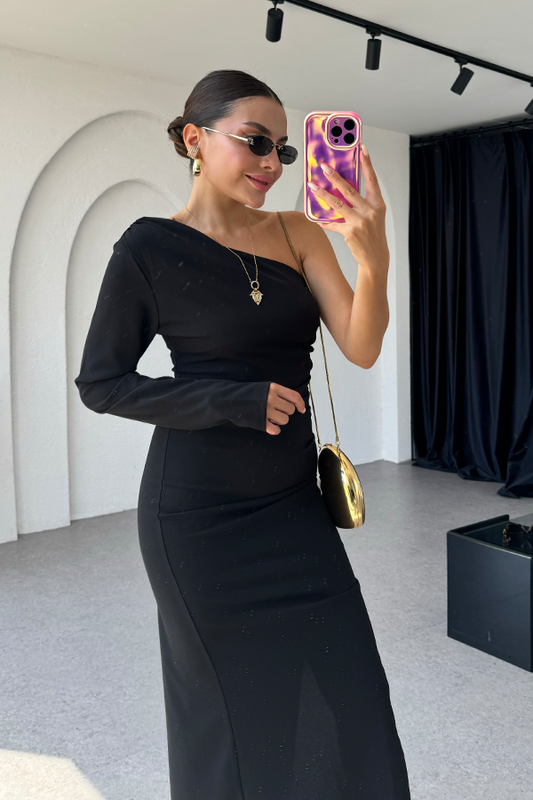 3 AL 2 ÖDETulina tek omuz siyah drapeli elbise