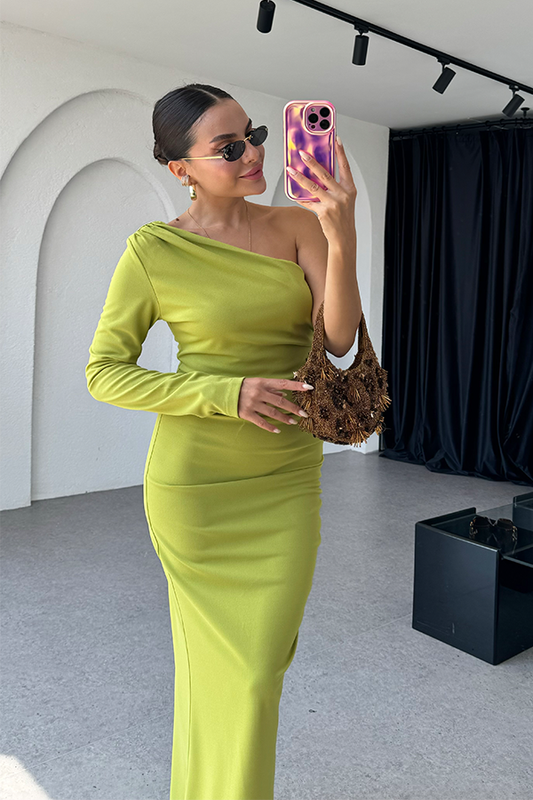 3 AL 2 ÖDETulina tek omuz yağ yeşili drapeli elbise