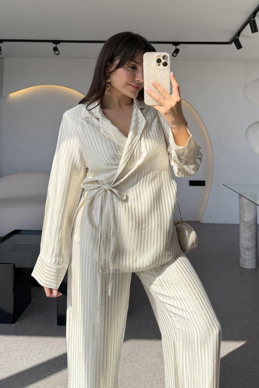 Bethani Ekru Vatkalı Şeritli Saten Dokulu Takım