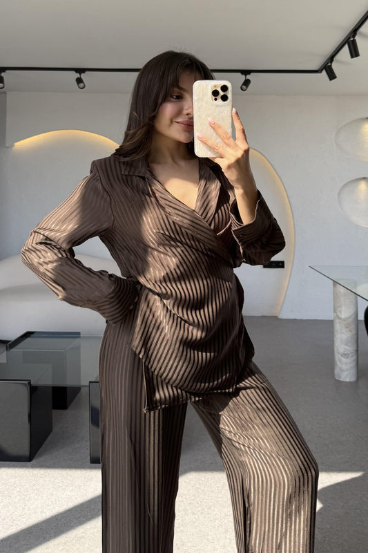 Bethani Kahve Vatkalı Şeritli Saten Dokulu Takım