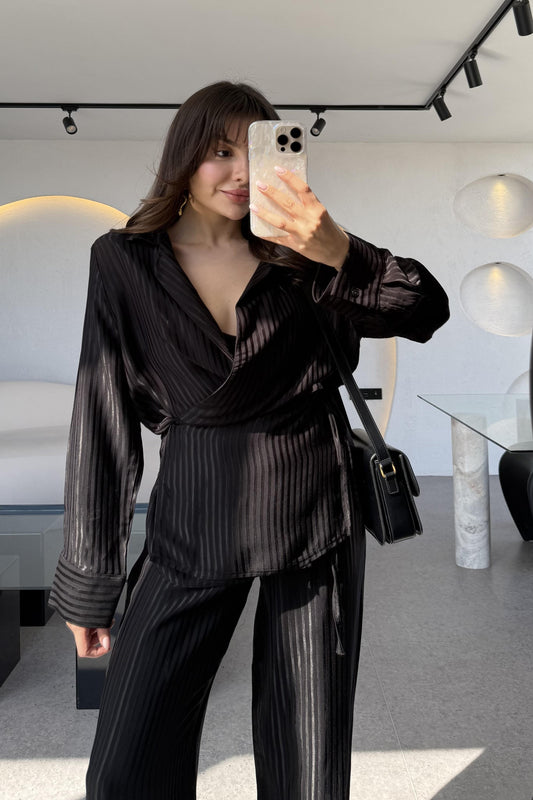 Bethani Siyah Vatkalı Şeritli Saten Dokulu Takım